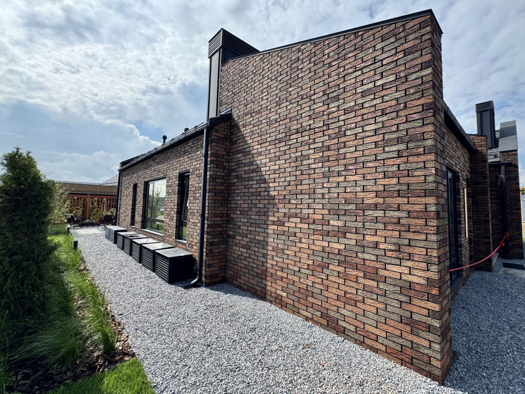 Еще один практический момент — формат. Для некоторых фасадов выбирают формат «евро» 250×85×65, когда нужна более изящная и визуально легкая кладка. Такой формат особенно популярен в современной архитектуре частных домов и хорошо смотрится на вытянутых плоскостях стены.
